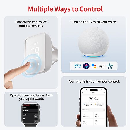 Helps Consolidate All Your Infrared Remotes: With Smart Learning, our smart home hub can help you add tons of home appliance infrared remotes to our app to help make home life simple. You'll then be able to control appliances such as TVs, Air Cons, and more using Voice Commands (e.g. Alexa) or even using our app or your Apple Watch.
