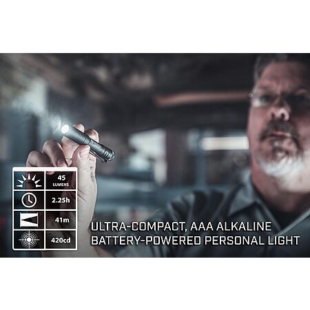 • White LED delivers 45 lumens; 41m beam; runs 2.25 hours