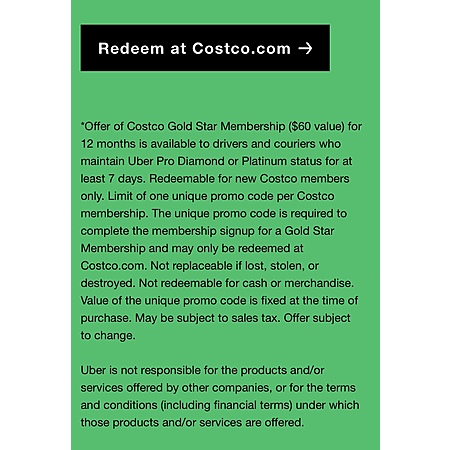 UberEats - FREE 1 Year Costco Membership For Platinum/Diamond Drivers - $0
