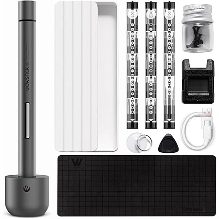 Wowstick mini electric screwdriver set includes 69 parts: 56 S2 material precision dedicated screw driver bits, 1 electric screwdriver, 1 fixing base, 1 magnetic plate, 1 storage box(storage plus), 1 plastic pry, 1 magnetizer, 1 USB cable(type-c), 1 plastic suction cup, 1 storage bottle (with screws), 1 instruction manual (material composition table). Suitable for tablet computers, mobile phones, watches, electronic bracelets, cameras, precision instruments, etc.