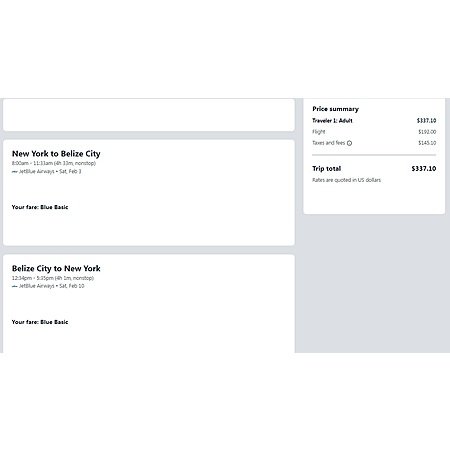 JetBlue Airways have round trip airfares travelling from New York (JFK) to Belize City (BZE) for $338, nonstop! These are basic blue fares, a restricted-type fare that will allow a personal item. There is no carry-on bag, no seat selection and no change. If you are travelling with children, you will be seated together as per JetBlue's policy.