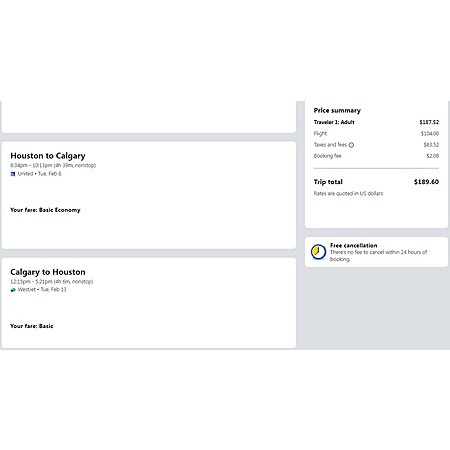 Westjet/Delta and/or United/Air Canada have round trip airfares travelling from Houston (IAH) to Calgary Alberta Canada (YYC) for $190, nonstop. These are basic economy fares that include a personal item and a carry-on bag. There is no seat selection and no change. Dates in January are much lower that $190 (FYI).