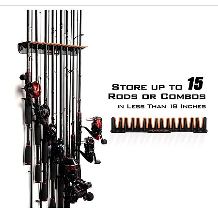 KEY FEATURES - Store up to 15 fishing rods or fishing rod and reel combos in less than 18" of wall space – Innovative Patented Design (U.S. Patent No.7,237,685) fishing pole holder is easy to use – Easy installation with only 3 screws. Affordable Innovation.