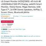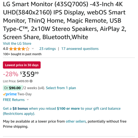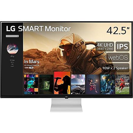 Work Smart, Play Smart - LG Smart Monitor is designed for multitasking while you work, play and watch. Connect the 43" display to a laptop, desktop or gaming console to immerse yourself in your work or games. Or, with the display's LG webOS built-in, you can watch favorite shows from your favorite streaming apps.