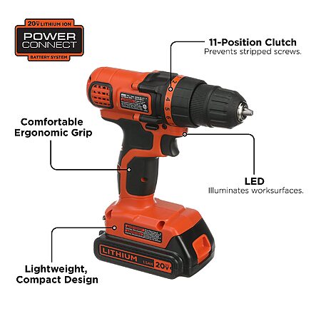 BLACK+DECKER 20V MAX Lithium-Ion 3/8" Cordless Drill/ Driver w/ LED Work Light, Battery & Charger (LDX120C)on sale for