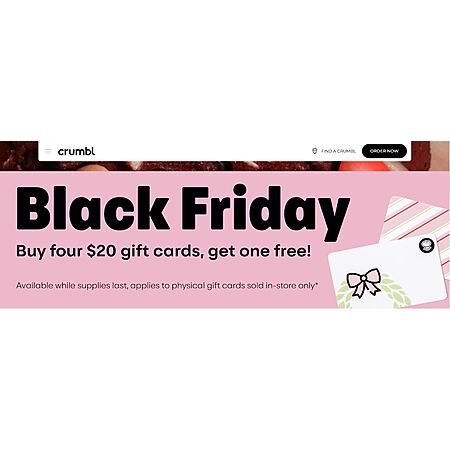 Crumbl Cookies[crumblcookies.com] Black Friday offer of buy 4 $20 Gift Cards and get a $20 Gift Card for Free. Valid In-Store, Physical Gift Cards ONLY and while supplies last.