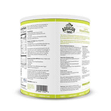 The Augason Farms Freeze Dried Sliced Strawberries are naturally sweet and can be reconstituted and used in any recipe that calls for fresh strawberries—they're that good. Perfect straight from the can as a delicious way to get your daily Vitamin C. No matter the case, this #10 can is an absolute essential in an emergency: it's easy to transport and includes all your food storage needs. Make the wise decision and let Augason Farms give you a peace of mind that's as indispensable as it is delicious. Family owned and operated since 1972, Augason Farms believes that great taste is a tradition worth preserving. They'll provide you with delicious peace of mind with their food essentials.Augason Farms recognizes that today's consumers are more concerned than ever before about what kind of foods they eat, and want to provide their families with food that is safe and the best quality. Whether enjoying Augason Farm's products for everyday meals, as an emergency food supply, or years down the road, you can be confident that Augason Farms long-term food storage products are guaranteed for quality and taste every time.Please discard oxygen absorber after opening.Best when stored in a cool dry place at temperatures between 55° and 70° F (ideal humidity 15%).