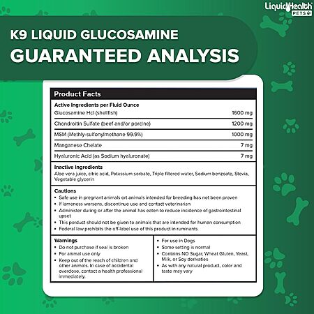 The perfect supplement to help with joint deterioration, aches, pains, and reduced mobility! Liquid Health's K9 Glucosamine liquid supplement helps prevent these symptoms and more, giving your dog a more active and happy life!