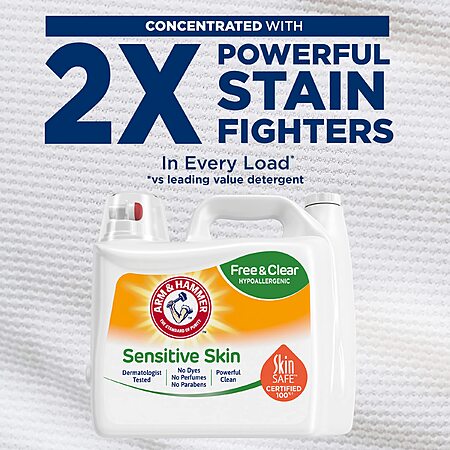 Product Description from Store- One 140 fl oz bottle of ARM & HAMMER Sensitive Skin Free & Clear Liquid Laundry Detergent, Free and Clear Detergent that cleans 140 medium loads when used as directed