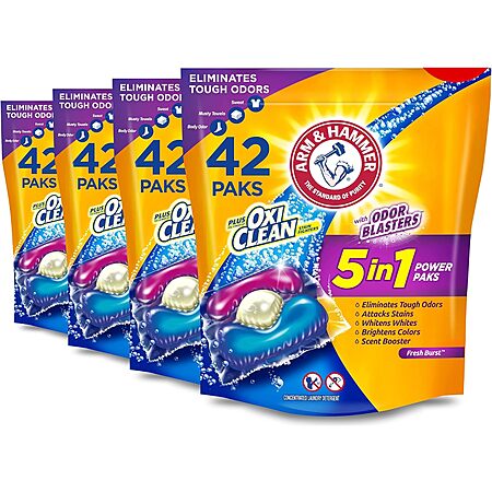 Amazon has 4-Pack 42-Count Arm & Hammer Plus OxiClean w/ Odor Blasters 5-in-1 Laundry Detergent Power Paks or $32.99 - 25% when you clip the coupon on product page - 5% when you checkout via Subscribe & Save = $23.09 -> now $24.37. Shipping is free w/ Prime or on $35+.