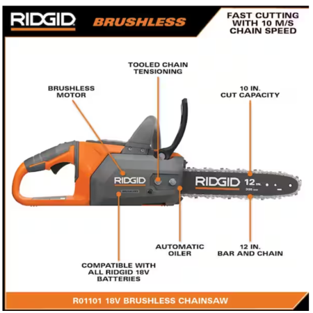 Model: RIDGID 18V Brushless 12 in. Electric Battery Chainsaw (Tool Only)
