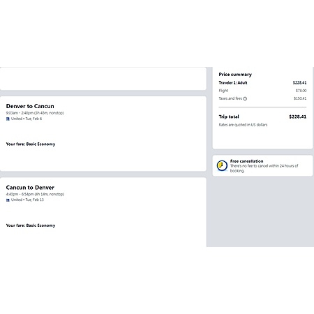 United Airlines have round trip airfares travelling from Denver (DEN) to Cancun Mexico (CUN) for $229, nonstop. These are basic economy fares, a restricted-type fare that only include a small personal item. There is no seat selection, no carry-on bag and no changes. If you are travelling with children, you will be seated together as per United's policy.