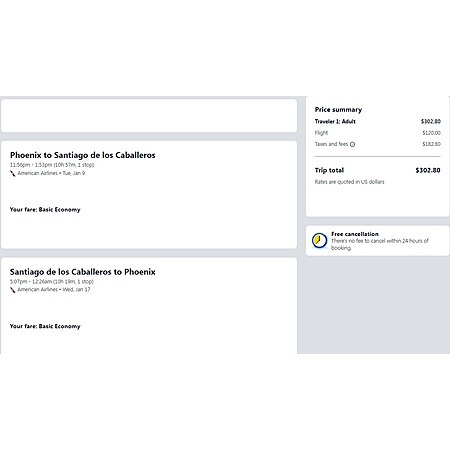 American Airlines have round trip airfares travelling from Phoenix (PHX) to Santiago de los Caballeros, Dominican Republic (STI) for $303-$313, making 1 stop. There are more flights available making 2 stops so filter and choose what you prefer when booking. These are basic economy fares, a restricted-type fare that allows a personal item and a carry-on bag. There is no seat selection and no change. If you are travelling with children, you will be seated together as per AA's policy.