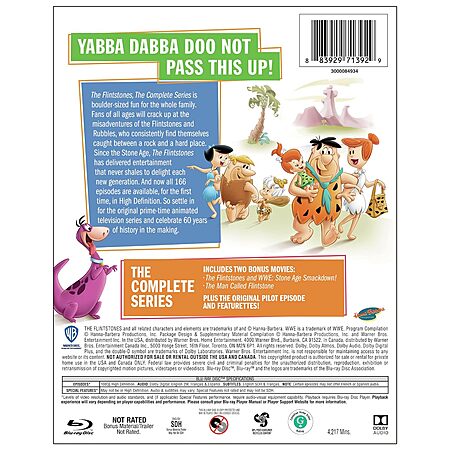 Yabba Dabba Doo Not Pass This Up! THE FLINTSTONES, The Complete Series is boulder-sized fun for the whole family. Fans of all ages will crack up at the misadventures of the Flintstones and Rubbles who consistently find themselves caught between a rock and a hard place. Since the stone age, The Flintstones has delivered entertainment that never shales to delight each new generation. And now all 166 episodes are available, for the first time, in high definition. So settle in for the first primetime animated television series and celebrate 60 years of history in the making.