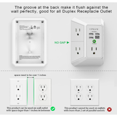 【The Groove Design on The Back and Wide space 】- 5 AC outlets with 2.1 inches long space in between, larger than standard 1.5-inch socket. Larger spacing makes it easier to use for all kinds of equipment. The groove at the back make it flush against the wall perfectly, good for all Duplex Receptacle Outlet. NOTE: This product can be used on wall outlet with space lager than 1 inches in between ,This product cannot be used on outlets with more than 2 set of parallel sockets.