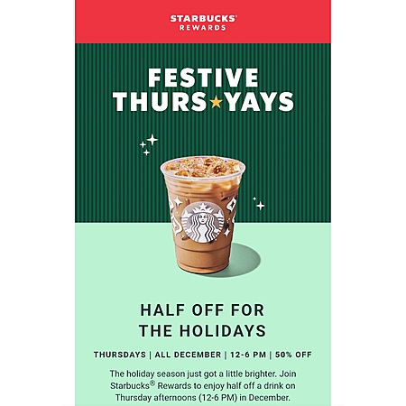Last Thursday we bought 2 drinks on same order thinking it was going to be 1/2 off each but they only took 1/2 off one and the other was full price. SB will nickel and dime you every way they can.