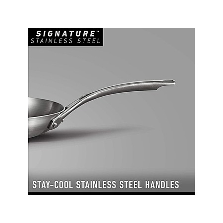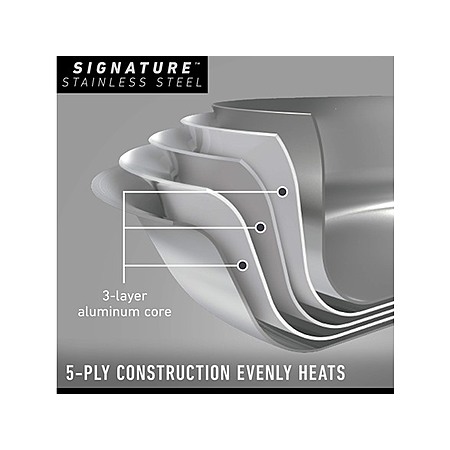 Calphalon Signature Stainless Steel Cookware features a 5-ply metal construction with a triple-layer aluminum core, for exceptional even heating and precise temperature control. The stainless steel interior and exterior provide a modern, stunning look, and stay-cool long handles provide heat resistance when cooking on the stovetop. Discover professional-level precision and performance with Calphalon Signature, and experience cookware that cooks just as well as it looks.