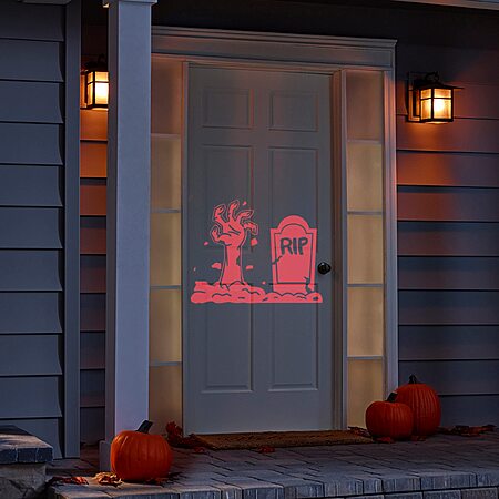 SPOOKY ZOMBIE HALLOWEEN DECORATION - Add a fun and spooky Zombie hand and RIP light projector to your yard. This glowing red zombie hand is sure to thrill trick-or-treaters this Halloween.