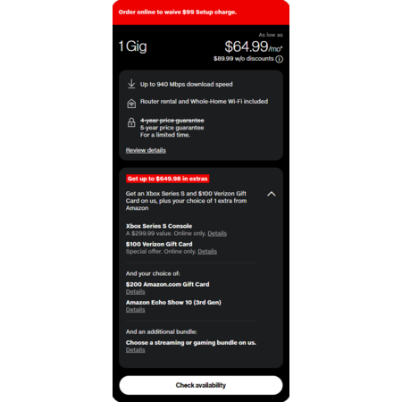 New 1 Gig Fios Home Internet Customers: Xbox Series S Console + $100 Verizon Gift Card + Your Choice of $200 Amazon Gift Card or Amazon Echo Show 10 (3rd Gen)