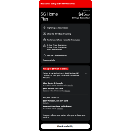 New 5G Home Plus Customers: Xbox Series S Console + $100 Verizon Gift Card + Your Choice of $200 Amazon Gift Card or Amazon Echo Show 10 (3rd Gen) for Free when you
