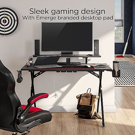 With rigorous performance testing and next-level features that can be customized to complement your personal playing style, Emerge helps you up your game. Built in monitor platform, cable management, add on storage pieces, and integrated lighting help yo.With rigorous performance testing and next-level features that can be customized to complement your personal playing style, Emerge helps you up your game. Built in monitor platform, cable management, add on storage pieces, and integrated lighting help yo.Black and carbon fiber laminate gaming desk.Desk has a cable management tray, cable slot, and grommets for organization.Overall dimensions: 35"H x 47.2"W x 26.6"D.Headphone hook and cup holder attachments for storing accessories.Raised monitor platform and 6 color LED lighting strip.Raised monitor platform and 6 colour LED lighting strip.Dimensions of platform: 39.3"W x 7.8"D.Black and carbon fiber laminate gaming desk.Headphone hook and cup holder attachments for storing accessories.Includes an Emerge gaming desk pad.Width with attachments: 54.3"W.Width with attachments: 54.3"W.Desk has a cable management tray, cable slot, and grommets for organization.Dimensions of platform: 39.3"W x 7.8"D.Includes an Emerge gaming desk pad.Overall dimensions: 35"H x 47.2"W x 26.6"D.Black metal legs and adjustable feet levelers.1 Year Limited Manufacturer Warranty.