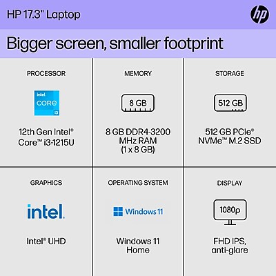 HP Laptop: i3-1215U, 17.3" 1080p, 8GB DDR4, 512GB SSD