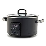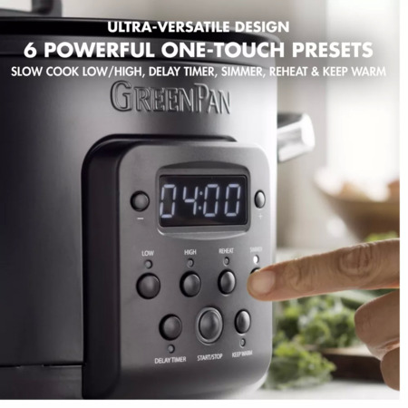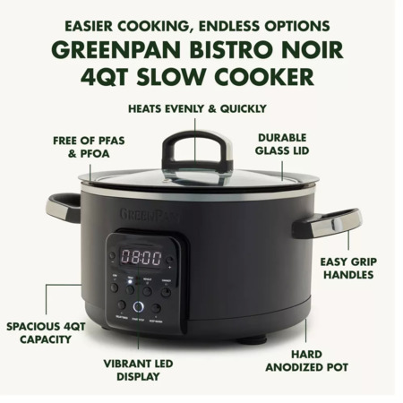 Indulge in mouthwatering meals with the press of a button! GreenPan's Bistro Noir 4-Quart Slow Cooker is has 6 one-touch presets for low heat, high heat, delay timer, simmer, reheat, and keep warm. The heavy-duty pot is hard anodized for extra durability and amazing heat conduction. Take your time cooking then clean up quickly with GreenPan's Thermolon™ Volt coating, a healthy ceramic nonstick that's free of PFAS, PFOA, lead, and cadmium. Specially designed to withstand the strain of modern appliances, this diamond-infused ceramic nonstick doesn't break down the way traditional coatings do. It's extra tough, cleans easily, and makes any meal healthier. Plus, the removable pot pops out and rinses clean, or place in it in dishwasher safe for tough messes.