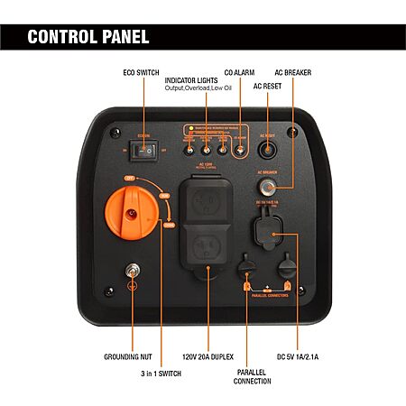The power panel includes low oil alarm,overload alarm, and output indicator features"Eco mode" for conserving energy and maximum fuel efficiency,two 120V/20A outlets,one USB Duplex: 5V DC that come in 1 amps and 2.1 amps.