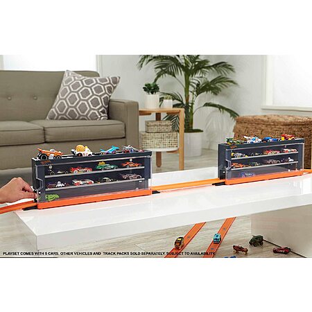 - Connect the case directly to Hot Wheels tracks and watch cars race through the transparent windows where stored vehicles can be pulled into action at any time.