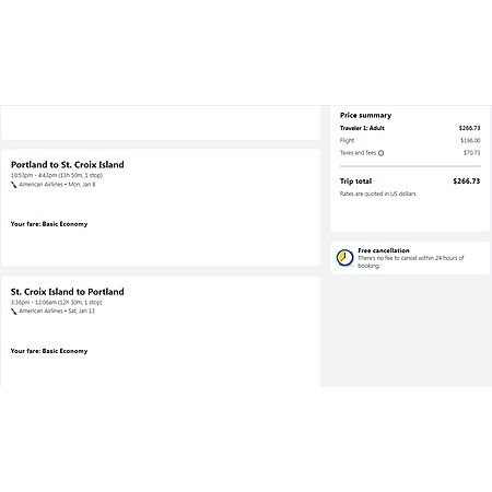 American Airlines have round trip airfares travelling from Portland OR (PDX) to St Croix USVI (STX) for $267, making 1 stop. These are basic economy fares, a restricted-type fare that allows a personal item and a carry-on bag. There is no seat selection and no change. If you are travelling with children, you will be seated together as per AA's policy.