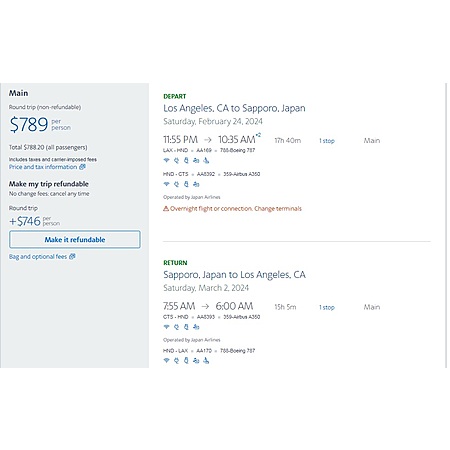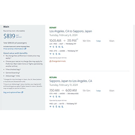 Japan Air Lines / American Airlines have round trip airfares travelling from Los Angeles (LAX) to Sapporo Japan (CTS) for $839, making 1 stop in Tokyo both ways. These are main cabin, regular economy fares that include seat selection, a personal item, a carry-on bag, a free checked bag and free change (fare difference apply, if any).