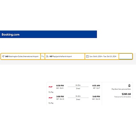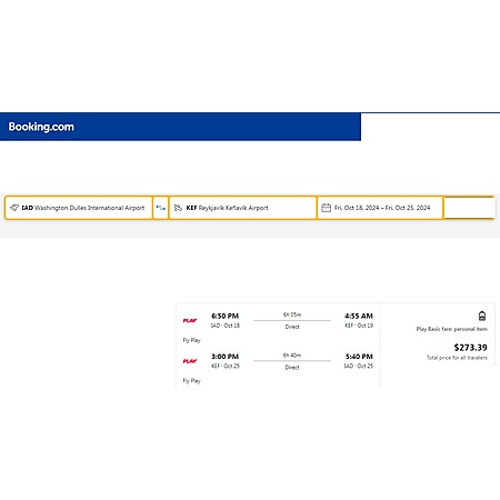 Play Airlines, an ultra low-cost 'no frills' Icelandic low-cost airline via Booking.com have round trip airfares travelling from Washington DC (IAD) to Reykjavik Iceland (KEF) for $274-$290, nonstop. These fares are basic economy fares that include a small personal item that fits under the seat in front of you. There is no seat selection, no carry-on bag and no change.