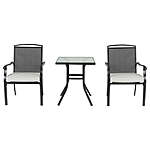 Mainstays Alexandra Square 3-Piece Outdoor Furniture Patio Bistro Set, Gray 3 piece outdoor patio bistro set Chairs feature woven sling backs for ventilation Soft olefin covered cushions with a polyvinyl coating to provide weather resistance Tempered glass top side table Durable steel frame for a long life 1 part of the entire Mainstays Alexandra Square collection of outdoor furniture (other pieces sold separately) Chair weight capacity 250 lbs. Easy to care for: Use a mild solution of soap and water; pat out excess moisture with dry towel after rinsing; air dry. Never use bleach or strong solvents for cleaning. Arrives in 1 box Shipping dimensions: 38.93" x 12.60" x 25.59"; 45.79lbs Site to Store Pickup Note: This item is packaged in 1 large box that may not fit in a standard-sized vehicle. Please make sure you have a large car or truck for store pickup.