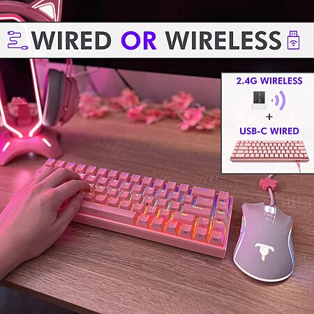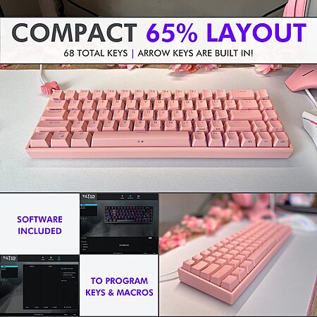 Tilted Nation 65% Percent Rechargeable Wired or Wireless Hot Swappable RGB Keyboard in Pink - $19.99 @ Amazon