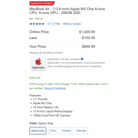 MacBook Air - (13.6-inch) Apple M2 Chip 8-core CPU, 8-core GPU - 256GB SSD - 8GB RAM $899.99