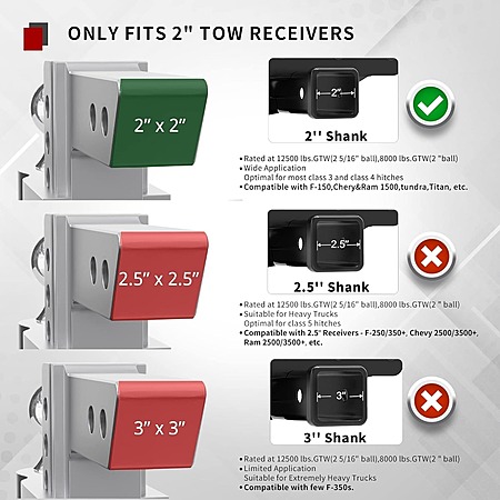• Dual balls are sized 2 5/16'' and 2'' with strong towing capacity (GTW) of up to 10,000lbs and 7,000lbs