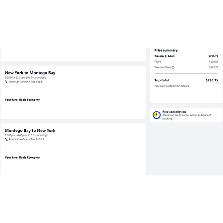 American Airlines and Delta Air Lines have round trip airfares travelling from New York (JFK) to Montego Bay Jamaica (MBJ) for $297, nonstop. These are basic economy fares, a restricted-type fare that allows a personal item and a carry-on bag. There is no seat selection and no change. If you are travelling with children on American, you will be seated together as per AA's policy.