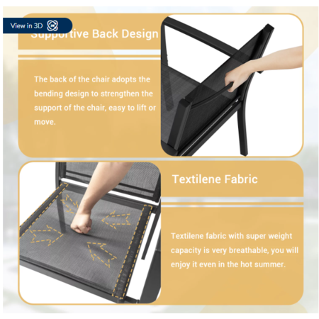 This is our 4-piece outdoor patio metal conversation furniture set including 1 coffee table 1 loveseat and 2 armchairs. The overall design style of this set is simple and modern. The fashionable style and exquisite workmanship can perfectly embellish your home and yard. We believe you will love it. The frame of the whole set is made of Powder-coated steel tubes. This kind of steel tube is stronger and does not deform easily. And the Powder-coated can reduce the erosion of the frame by rain. The back and seat of the chair are woven from Textilene with many meshes. This quality material is very breathable and you will enjoy it even in the summer. And when it is dirty just wipe it with a damp cloth or a dry cloth. The bending design of the back of the chair allows you to lift it. With this design you can move the set easily. Besides It helps you avoid leaving scratches on the floor as you move the chair.
