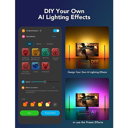 • Responds to Specific Game Actions: Govee's CogniGlow algorithm recognizes your in-game actions for compatible gaming titles, displaying real-time specialized light effects while selecting a character, using an item, eliminating enemies, etc.