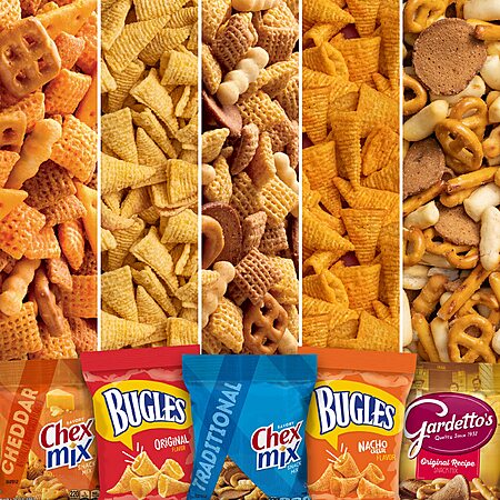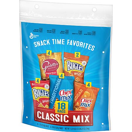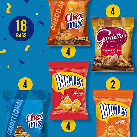 - Featuring 5 delicious snack bag flavors among the 18 total snack bags: 4 Gardetto's, 4 Bugles Original, 2 Bugles Nacho Cheese, 4 Chex Mix Traditional, and 4 Chex Mix Cheddar
