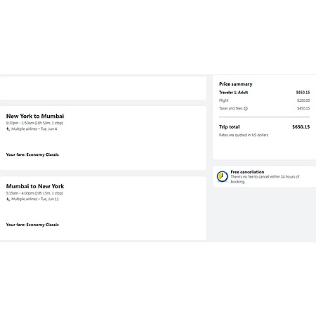 Round trip airfares travelling from New York (JFK) to Mumbai India (BOM) are $651, making 1 stop in London, both ways on Virgin Atlantic, Delta and Air India (mixed airlines depending on the flight you choose). While the transatlantic flight is on Virgin Atlantic/Delta, the flight between Mumbai & London will be on Air India. These are economy classic fares that include a personal item, a carry-on bag, seat selection and 2 free checked bags.