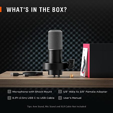 • Warm Tips: 1. The recording studio product comes with a dynamic microphone with shock mount, an 8.2ft (2.5m) USB C to USB cable, a 5/8'' to 3/8'' adapter, a user's Manual (XLR cable, boom arm, mic stand not included). 2. When using XLR connection, it is suggested to use XLR to XLR cable for more stable audio.