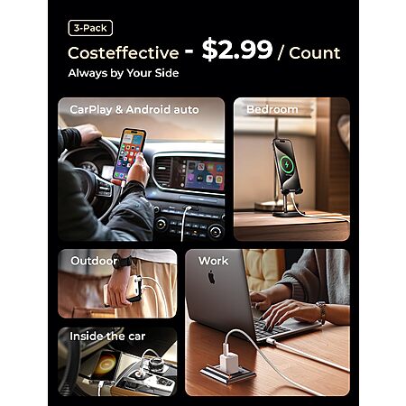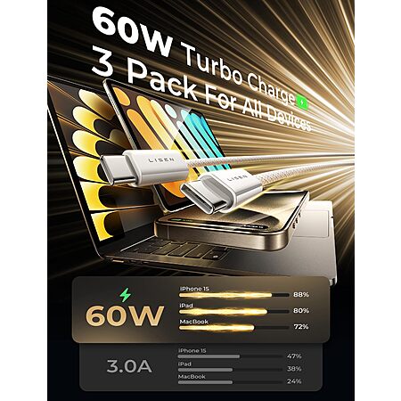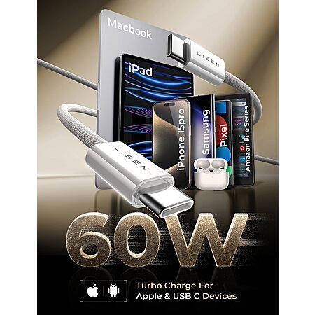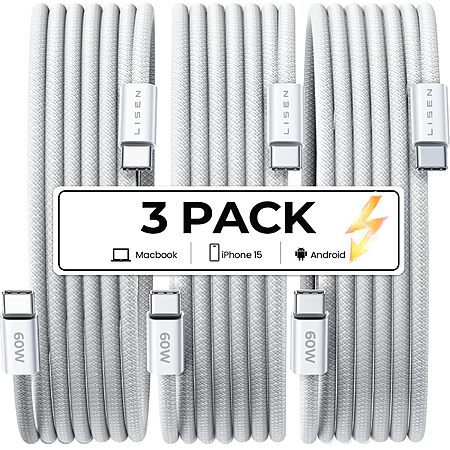 LISEN Direct via Amazon has 3-Pack LISEN 6.6' 60W USB-C to USB-C Charger Cables (2E333) on sale for $9.99 - $4.30 off when you apply promo code 43CXDIRO on the checkout page = $5.69. Shipping is free w/ Prime or on $35+ orders.