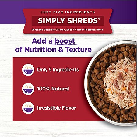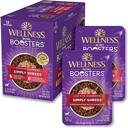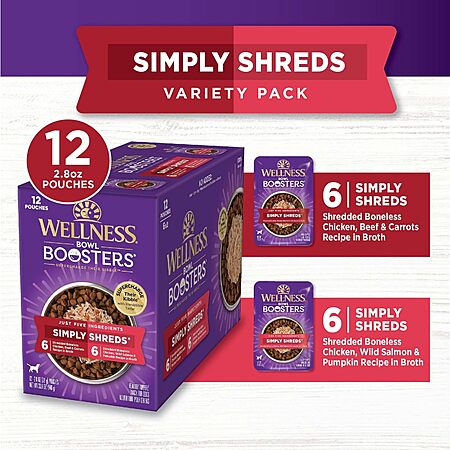 12-Pack 2.8-Oz Wellness Bowl Boosters Simply Shreds Natural Grain Free Wet Dog Food Mixer/Topper/Snack (Variety Bundle) on sale for $19.98 - 5% off when you checkout via subscribe & save -