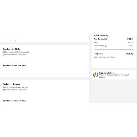 Hawaiian Airlines have round trip airfares travelling to and from Boston (BOS) and Oahu Honolulu Hawaii (HNL) for $429, nonstop. These are main cabin BASIC fares that will only allow a personal item and a carry-on bag. There is no seat selection and no change. On Hawaiian, you will be served a complimentary meal and you may select your seat once you check-in for the flight.