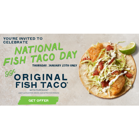 During the one day event on Thursday, Jan. 25, The Original Fish Taco will be 99 cents with a purchase. The limit is four per order, one per person. Just enter FISHTACO at checkout for online and app orders or scan the QR code on the coupon in restaurants.