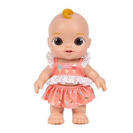 - 3-PIECE DOLL SET - This Sprinkles Sun Smart baby doll set includes one 10-inch realistic baby doll, plus a removable frilly doll swimsuit top and a skirted bottom.