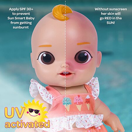 - UV-ACTIVATED SKIN - If you forget to apply SPF 30+ sunscreen (sold separately) to your baby doll, her fair skin will turn red.