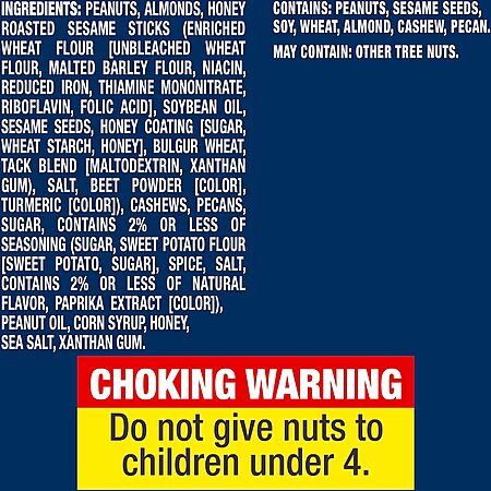 PEANUTS, ALMONDS, HONEY ROASTED SESAME STICKS (UNBLEACHED WHEAT FLOUR [CONTAINS MALTED BARLEY FLOUR], SOYBEAN OIL, SESAME SEEDS, BULGAR WHEAT, SUGAR, MALTODEXTRIN, WHEAT STARCH, SALT, BEET POWDER AND TURMERIC [VEGETABLE COLOR], HONEY, XANTHAN GUM, SOY LECITHIN), CASHEWS, PECANS, SUGAR, PEANUT OIL, HONEY, CORN SYRUP, SEA SALT, DRIED SWEET POTATO, SPICES (INCLUDES CINNAMON), SALT, NATURAL FLAVOR, PAPRIKA EXTRACT (COLOR), XANTHAN GUM.