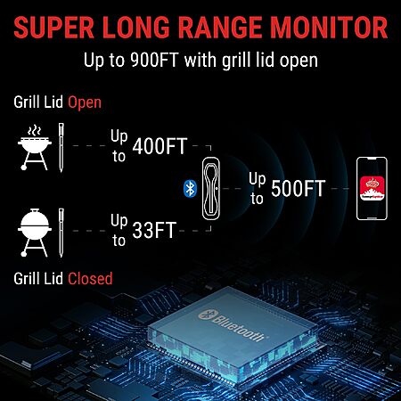 Features:- 500-Ft Ultra-Long Range: Connected via the most advanced Bluetooth 5.2, this wireless thermometer for grilling can monitor your cooking from up to 500 feet away without obstacles, make it outstand from other smoker accessories